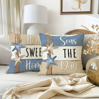 Set of 4, Blue Ocean Starfish Throw Pillow Covers, 18×18 Inch, Vintage Shell Embellished Home Decor Cushion Covers, Spring and Summer Seasonal Pillow Covers, Perfect for Bedroom, Porch, Patio, Sofa and Outdoor Decoration, Pillow Core Not Included