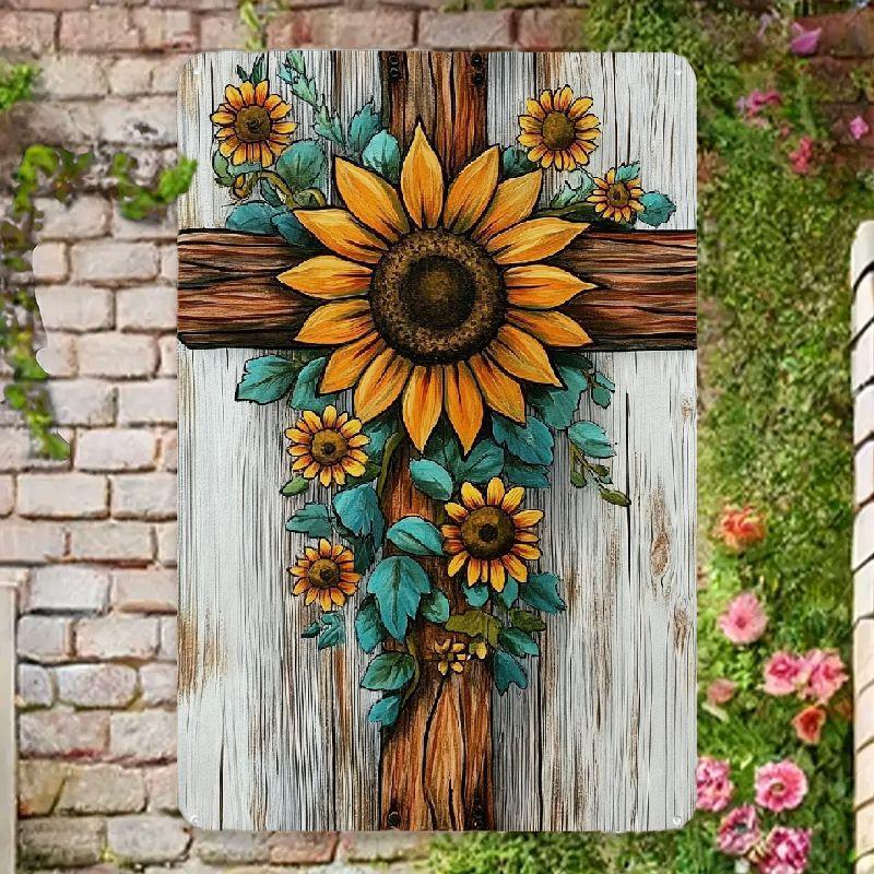 Charming Sunflower Cross Vintage Metal Sign – 8″x12″ Rustic Wall Decor for Home, Bar, Garage & Man Cave | Durable Iron Material, Easy to Hang Design | Ideal Gift Choice